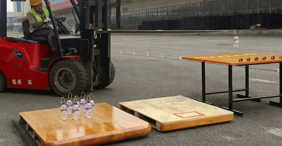 本项目聚焦转弯角度控制与行驶平衡能力。选手们驾驶叉车,叉起载有8瓶矿泉水的托盘,沿着预设路线灵活绕过障碍物,并精准叉取每一瓶矿泉水有序放置到规定区域,转向、避让、定位一气呵成。充分展现了高超的操控技巧与极强的现场应变能力,完美诠释了 “安全与效率并重”的作业理念。